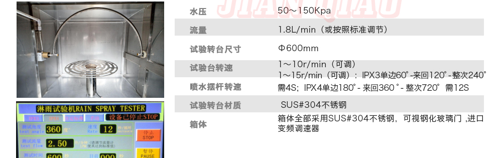 用途:可程式淋雨試驗(yàn)箱適用于電工電子產(chǎn)品(包括組件)、燈具照明產(chǎn)品、汽車摩托車零部件外殼和密封件等產(chǎn)品做外殼防護(hù)等級(jí)測(cè)試(IP 防水等級(jí)試驗(yàn)),模擬其產(chǎn)品在運(yùn)輸和使用期間可能受