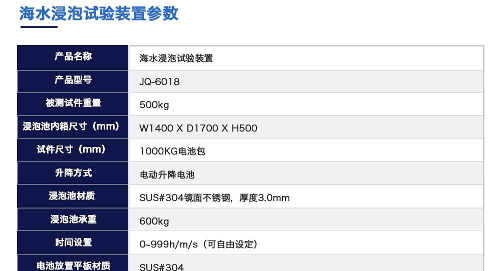 用途:海水浸泡試驗(yàn)裝置主要用于電池以實(shí)車裝配狀態(tài)與整車線束相連然后以實(shí)車裝配方向在常溫下的海水成分中浸泡2h(海水為模擬海水成分,濃度為3.5%NaCl溶液)水槽中海水深度要足以淹