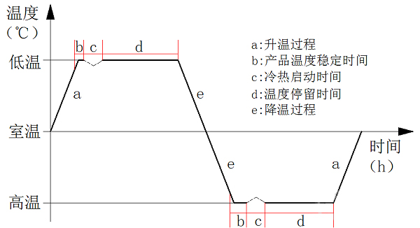 熱循環(huán)試驗是一種利用高低溫交變濕熱試驗箱對試驗產(chǎn)品進行的預設(shè)高低溫交替的應力考核,用以驗證材料和產(chǎn)品是否達到在研發(fā)、設(shè)計、制造中預期的質(zhì)量目標的一類可靠性試驗。通過大溫變速率可暴露產(chǎn)品潛在的材料與性能缺陷,經(jīng)過不斷地質(zhì)量改進,達到可靠性提升的目的。航天單機類產(chǎn)品一次熱循環(huán)示意圖見下圖1所示。